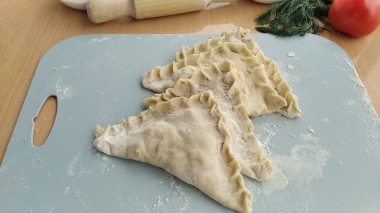 Скрепите края теста, чтобы пельмени получились в форме треугольников.