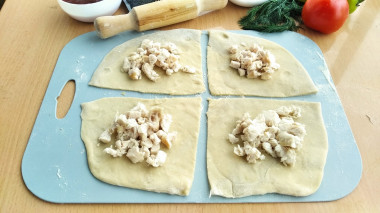 В центр каждого квадрата теста выложите немного приготовленного фарша.