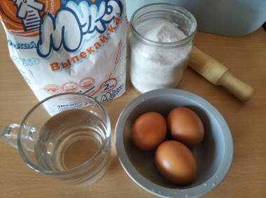 В глубокую миску просейте пшеничную муку, добавьте соль, влейте воду и добавьте куриные желтки, белки нам понадобятся для приготовления начинки, поэтому не выбрасывайте их.
