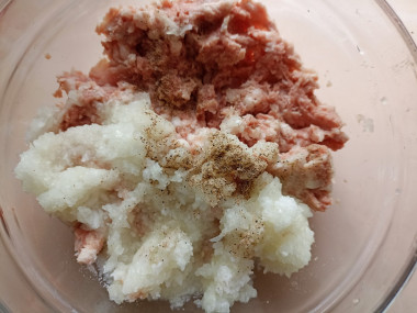 Пока выстаивается тесто, приготовим фарш для пирожков. Фарш можно использовать готовый или накрутить на мясорубке из свежего мяса. Фарш можно использовать из любого мяса, из мяса птицы получится менее калорийно, но из смешанного мяса свинины и говядины получится начинка вкуснее и сочнее. Добавляем в миску с фаршем мелко рубленный репчатый лук, соль, черный молотый перец по вкусу, немного холодной воды, перемешиваем до получения однородной массы.