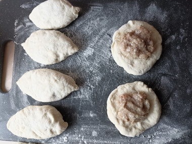 Раскатываем их в небольшие лепешки, в центр каждой лепешки кладем немного мясной начинки, скрепляем края.