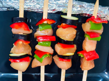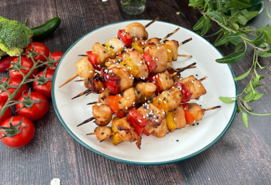 Куриный шашлык на шпажках в духовке такой яркий, что сразу же захотелось приготовить. Соус тереяки заменила соевым соусом, добавила сахар. От себя добавила на две шпажки кружочки баклажан. У меня не было времени, поэтому мариновала всего 1 час, но филе прекрасно пропиталось, было мягким и сочным. Готовилось 30 минут, два раза переворачивала. С обеих сторон филе равномерно слегка поджарилось. С аппетитом съели со свежими овощами.