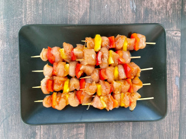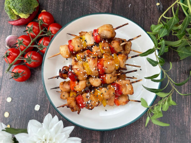 Возьмите длинные деревянные шпажки. На шпажки нанижите по 5-6 кусочков курицы, чередуя с ломтиками болгарского перца. С помощью силиконовой кисточки смажьте шашлычки оставшимся от маринования соусом.