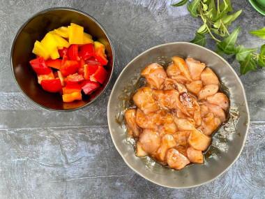 Нарезанное куриное филе выложите в глубокую миску. Добавьте паприку, влейте соус терияки и винный уксус.