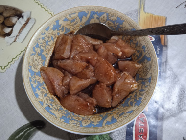 Все хорошо перемешайте. Поставьте курицу мариноваться в холодильник на 2 часа, а лучше на ночь.