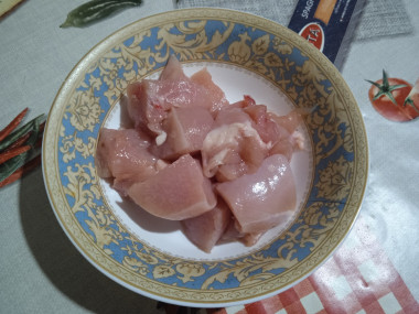 Куриное филе вымойте под проточной водой, обсушите бумажными полотенцами и нарежьте средними кубиками. Необходимо проследить, чтобы в мясе не осталось мелких косточек и осколков хрящей.