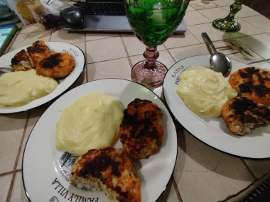 Подавайте куриные котлеты с любым гарниром на ваш вкус: отварной рис, гречка, макароны. Или картофельным пюре, как у меня. По желанию дополните свежей зеленью или салатом. Приятного аппетита!