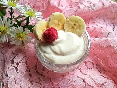 Творог отправьте в чашу блендера к банану, добавьте туда же густые сливки, сметану или ряженку, можно как альтернативу использовать несладкий йогурт или иной молочный продукт. Такие добавки влияют на калорийность готового продукта, поэтому выбирайте по своему усмотрению. Добавьте по вкусу сахар или не добавляйте его вообще, можете положить щепотку ванилина либо корицы.