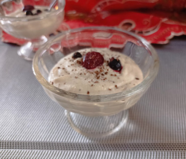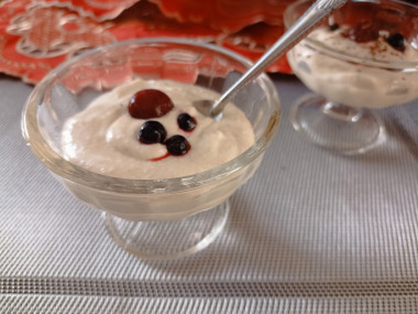 Приготовила домашнюю творожную массу. Творог взяла фермерский, точную его жирность не знаю, главное, что он мягкий и вкусный. Вместо сливок использовала 20% сметану. Все ингредиенты измельчала с помощью блендера. Получилась нежная творожная масса с лёгким ароматом ванилина и банана. Украсила десерт замороженными ягодами и тёртым шоколадом. Очень вкусно! Спасибо за рецепт, Snezhana!