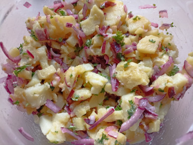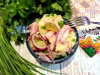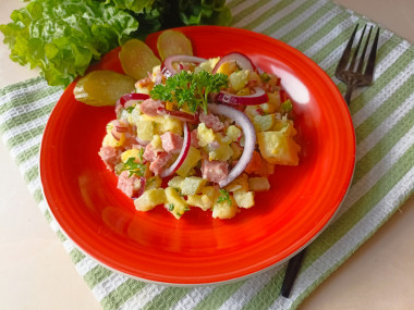Мне понравилось, что картошка в горячем виде хорошо впитывает все ароматы и вкусы соуса. Лук у меня тоже фиолетовый, он менее острый, чем обычный и даже чуть сладковатый. Огурчики взяла прошлогодние, они хорошо напитались рассолом и стали очень вкусными. Заправила салат оливковым маслом. Вместо колбасы взяла копченый карбонат.