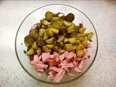 Салатик довольно сытным получается, им одним можно накормить всю семью. Посмотрите еще один вариант салата с солеными огурцами, колбасой и не только. Вкусный и питательный.