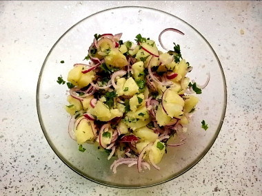Я очень люблю картофельные салаты и готовлю их часто, используя их как полноценное блюдо на обед или ужин. Сам картофель всегда есть дома, а дополнять его можно многими продуктами. Вроде бы простой рецепт салата, а интерпретаций его огромное количество. Поэтому экспериментируя с ингредиентами, можно готовить для себя каждый раз новый салат.