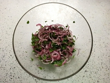 Приготовьте заправку для салата. Как сделать заправку? Возьмите сразу ту миску, в которой вы будете готовить салат. Салатный лук очистите от шелухи и мелко нашинкуйте. Залейте его винным уксусом. Перемешайте, слегка помяв лук ложкой. Зелень петрушки помойте, обсушите и мелко нарежьте. Добавьте нарезанную петрушку к луку, туда же положите зерновую горчицу и влейте растительное масло. Хорошо перемешайте заправку.