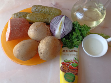 Как сделать салат с солеными огурцами и колбасой? Подготовьте продукты. Предварительно отварите картофель. Если картошка осталась с ужина, ничего страшного - салат хуже не станет. Колбаса у меня полукопчёная, но вкусно будет и с ветчиной, и с карбонадом. Масло берите любое растительное, вкус которого вам нравится. Я взяла красный салатный лук, можно использовать и обычный репчатый. У меня он маленький, если же луковица большая, возьмите половинку.Шаг 2: