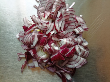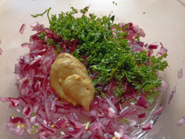 Приготовьте заправку для салата. Как сделать заправку? Возьмите сразу ту миску, в которой вы будете готовить салат. Салатный лук очистите от шелухи и мелко нашинкуйте. Залейте его винным уксусом. Перемешайте, слегка помяв лук ложкой. Зелень петрушки помойте, обсушите и мелко нарежьте. Добавьте нарезанную петрушку к луку, туда же положите зерновую горчицу и влейте растительное масло. Хорошо перемешайте заправку.Шаг 3: