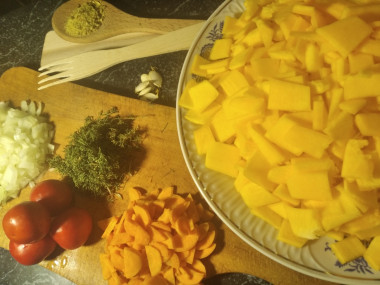Как пожарить тыкву с овощами на сковороде быстро и просто? Подготовьте необходимые ингредиенты.