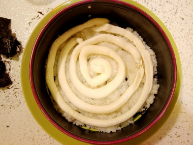 Поверх крабового мяса выложите нарезанные водоросли нори.
