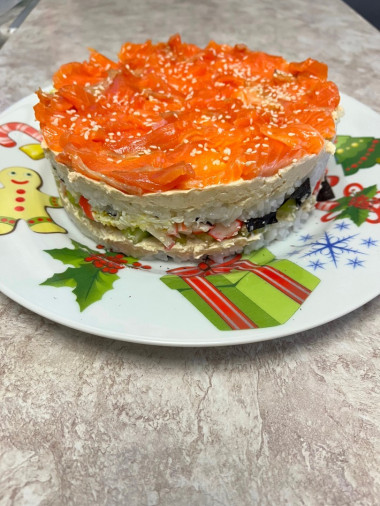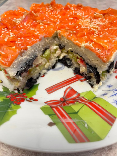 Рецепт Суши торт салат у меня в закладках уже давно, на каждый праздник собиралась его приготовить, но все не получалось купить ингредиенты. Наконец-то звезды сошлись и я это сделала) Впечатления от салата у меня самые приятные! Все делала по рецепту. Слои собирала в кольце от формы для выпечки диаметром 18 см. Мне кажется, получилась оптимальная высота) Очень понравилось, что в салате нет майонеза. Беспокоилась, что получится суховато, но напротив салат получился сочным. Тут и огурцы дают влагу и рисовый уксус в достаточном количестве пропитал рис. И сливочный сыр тоже хорошо скрепляет продукты и делает вкус нежным и приятным. Я бы в следующий раз взяла побольше нори, по два листа на слой, уж очень мне нравится эта водоросль) Рыбный слой у меня из форели, она была нарезана тонкими пластинками, как раз мне так и надо было. Кунжут слегка обжарила, так он ароматнее и вкуснее. Нарезали тортик ножом, тут как и при нарезки роллов нужно каждый раз очищать и смачивать нож, чтобы кусочки были аккуратные. Но можно и просто ложкой брать) Салат просто великолепный и на вид и на вкус. Гости были в восторге! Дети тоже с удовольствием поели, ведь это же "огромный ролл!" Действительно настоящий вкус моих любимых роллов! Сбылась моя мечта, буду теперь готовить этот суши-торт часто) Спасибо за рецепт!