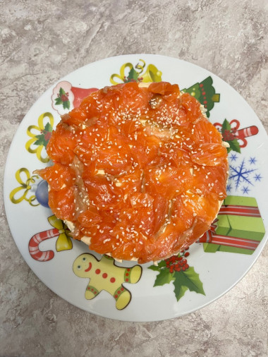 Последним слоем выложите нарезанную красную рыбу, а сверху посыпьте кунжутом. Торт Суши в домашних условиях готов. Приятного аппетита!
