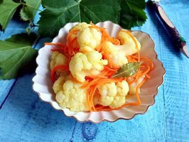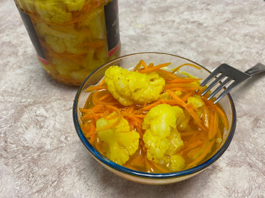 Цветная капуста - овощ на любителя, не каждому она нравится. Но угодить самому капризному едоку можно, приготовив из неё вот такую простую закуску. Капуста по-корейски получается очень ароматной; благодаря добавлению моркови и куркумы - яркой; а на вкус немного острой и пикантной.