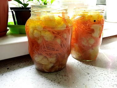 Это заготовка цветной капусты по-корейски для долгосрочного хранения. Для того, чтобы попробовать капусту на ужин, можно открыть банку через 5-6 часов. Приятного аппетита!