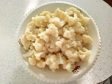 Свежую цветную капусту помойте, удалите листья и кочерыжку. Разберите капусту на маленькие соцветия. В кастрюлю налейте воды, доведите её до кипения. Опустите в кипящую воду капусту и проварить после закипания 7-8 минут. Капусту откиньте на дуршлаг и дайте стечь лишней воде.