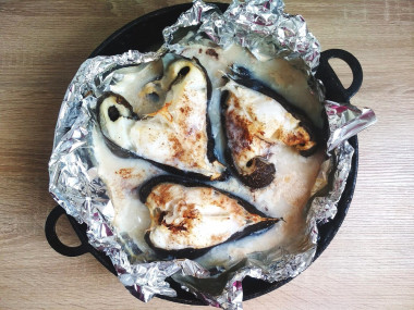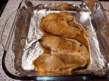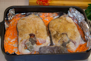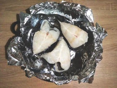 Затем форму для запекания застелите фольгой и смажьте немного растительным маслом. Выложите рыбу и поставьте форму в духовку, разогретую до 200 градусов на 30-35 минут. Точное время будет зависеть от возможностей вашей духовки и размера стейков.