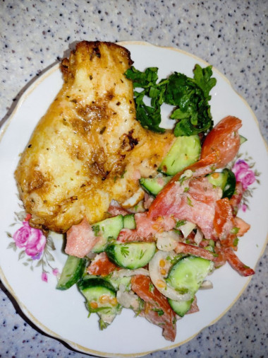 Мясо сочное, очень вкусное и нежное, в нем почти нет костей, цвет ее мяса белый, консистенция плотная, вкус немного сладковатый. Очень рекомендуя сбрызнуть готовые стейки соком лимона - очень освежает!