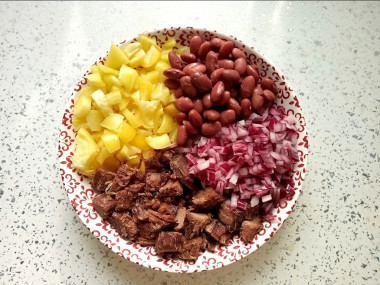Консервированную фасоль выложите в дуршлаг, промойте, дайте стечь воде и выложите в глубокую миску. Вместо консервированной фасоли можно использовать сухую, предварительно вымоченную и отваренную до готовности. В миску к фасоли отправьте остывшее жареное мясо.