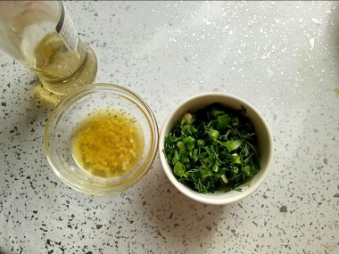 Болгарский перец и зелень отправьте в салатник к другим ингредиентам. Чеснок очистите от шелухи, пропустите через пресс или натрите на мелкой терке и добавьте в миску. Посолите и поперчите по вкусу. В качестве заправки будем использовать оливковое масло и винный уксус. По желанию вместо оливкового масла можно использовать подсолнечное, а вместо винного уксуса – яблочный или любой другой.