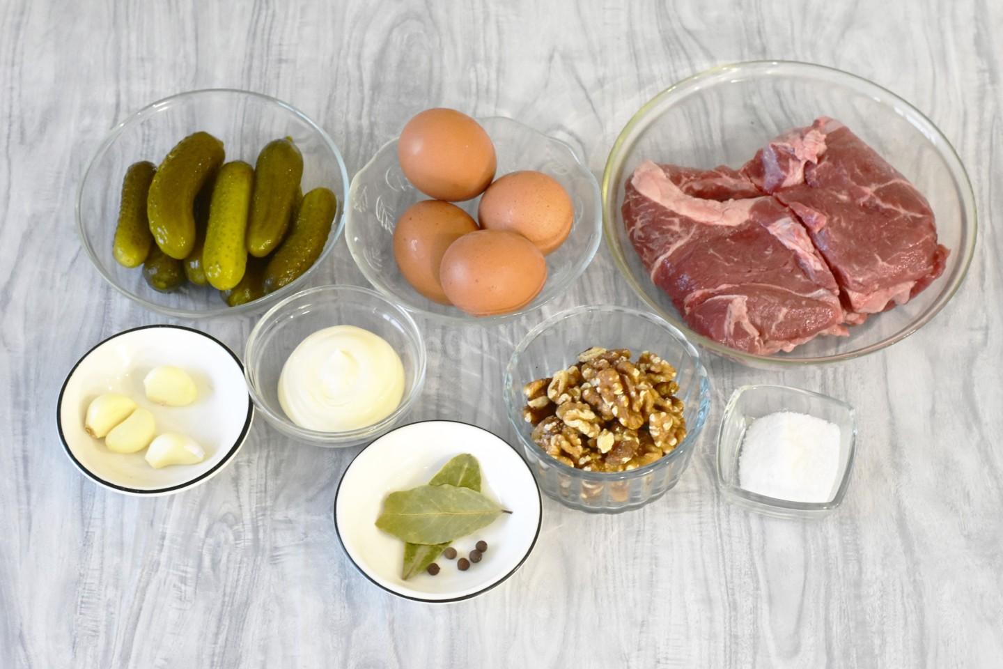 На тарелку установите кулинарное кольцо (Ø 14 см) и выложите слоями, промазывая каждый майонезом, говядину, соленые огурцы с чесноком, рубленые яйца и грецкие орехи. Поставьте салат на 1 час в холодильник для пропитки. Кулинарное кольцо снимите перед подачей.