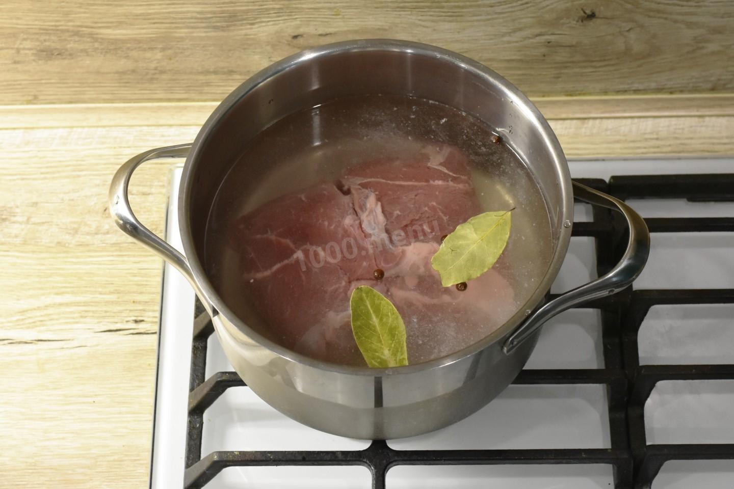 Говядину вымойте, выложите в кастрюлю. Добавьте лавровые листья, душистый перец. Влейте 1,5 л чистой воды. Поставьте кастрюлю на сильный огонь и доведите воду до кипения. Варите мясо на медленном огне под крышкой, снимая пену, около 2 часов до мягкости. В середине варки мясо посолите.