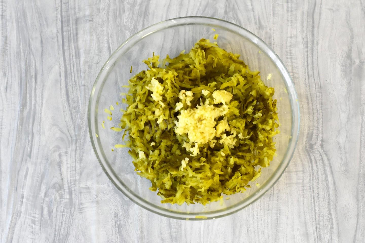 Соленые огурцы отряхните от рассола и натрите на крупной терке. Если огурцы очень водянистые, слегка отожмите их. В огурцы добавьте пропущенные через пресс зубчики чеснока и перемешайте. Соленые огурцы можете заменить на маринованные.
