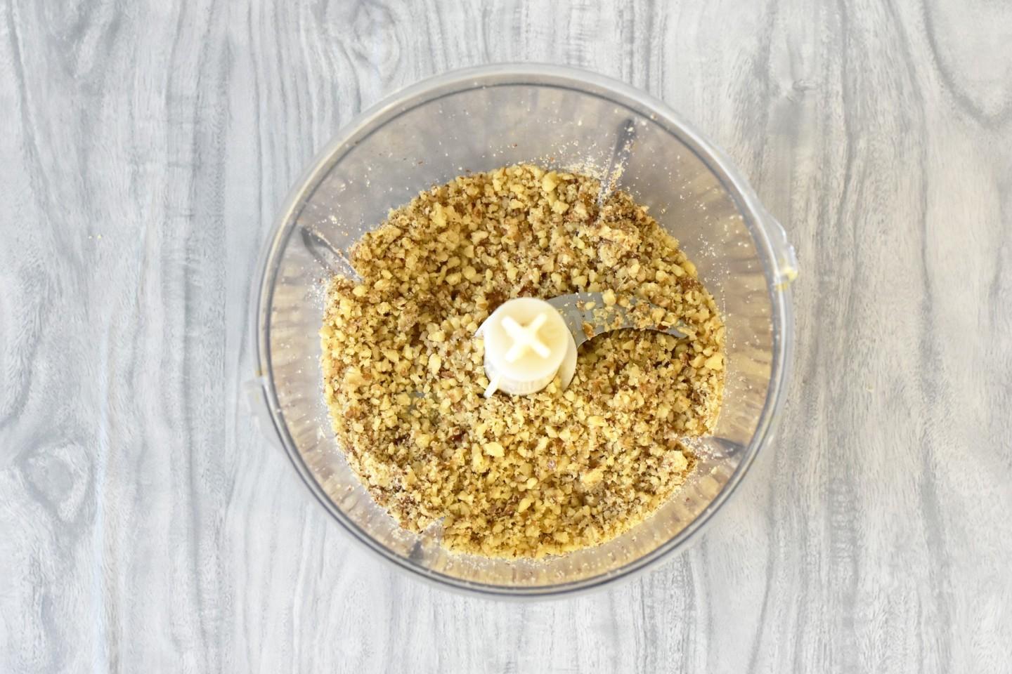 Грецкие орехи промойте, обсушите и прокалите на сухой сковороде. Затем измельчите в блендере в мелкую крошку или порубите ножом.