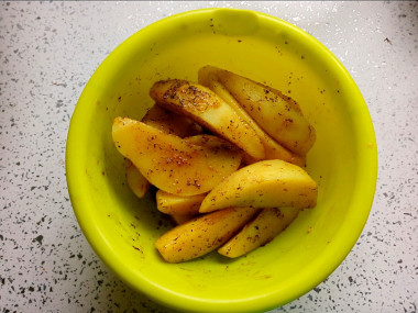 Форму для запекания выстелите пергаментной бумагой и смажьте подсолнечным маслом. Выложите сверху картофельные дольки в один слой и отправьте в разогретую до 200 градусов духовку. Запекайте картофель в течение 15 минут до образования золотистой корочки. Готовый картофель сразу подавайте на стол. Приятного аппетита!