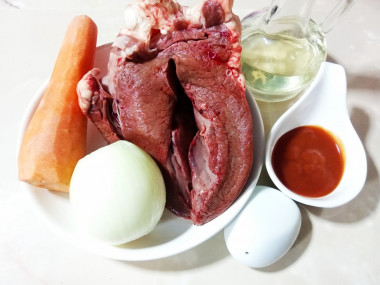 Подготовить указанные продукты. Для приготовления лучше использовать свежее не замороженное сердце. Морковь и лук среднего размера. Томатную пасту можно заменить томатным соусом или помидорами в собственном соку. Соль и перец по вкусу, можно использовать в приготовлении любимые специи.