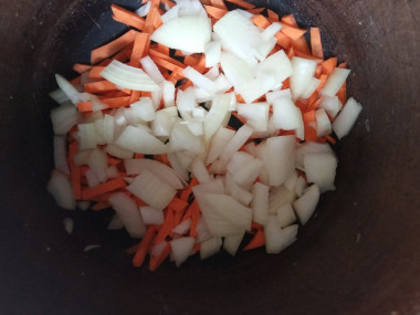 Морковь и лук очистить и измельчить. В чашу мультиварки налить растительное масло и обжарить овощи в режиме "Жарка" несколько минут. Добавить к овощам нарезанную мякоть сердца.