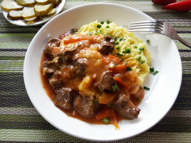 Очень простой и удобный способ. За счёт тушения с овощами и томатом кусочки сердца получаются мягкие, сочные. Соус аппетитный, с приятной томатной кислинкой. Можно подавать с любым гарниром. В этот раз я по примеру автора выбрала классическое сочетание с картофельным пюре. Вкусно и сытно. Спасибо автору за рецепт!