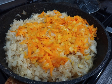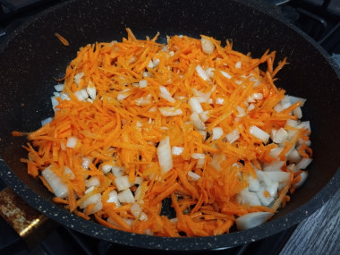 В глубокой и широкой сковороде разогрейте половину порции растительного масла. Переложите в сковороду морковь с луком. Обжарьте овощи на небольшом огне минут 7-10, помешивая их. Лук должен стать прозрачным, а морковь зазолотиться. Как только это произошло, лук и морковь переложите со сковороды в отдельную посуду. Сковороду вымойте или оботрите бумажным полотенцем. Или можете взять другую сковороду.
