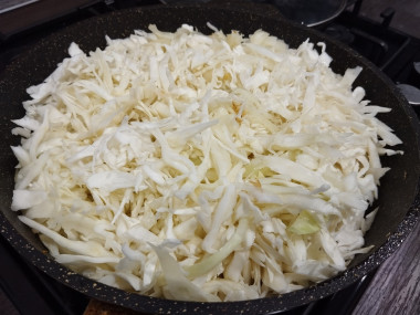 Верните очищенную сковороду на огонь, налейте в нее оставшееся масло и разогрейте его. Выложите в сковороду капусту. Если она у вас вся не влезла, подождите немного: капуста осядет и тогда вы сможете добавить еще. Жарьте капусту на медленном или среднем огне около 10-15 минут. Ориентируйтесь по своей плите.