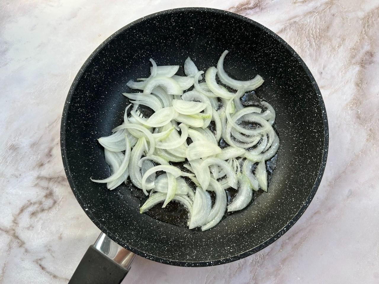 На сковороду налейте растительное масло, разогрейте его. Выложите нарезанный перьями репчатый лук, обжарьте его в течение 3-4 минут на среднем огне. С выбором масла для жарки читайте в конце рецепта. Выньте лук, использовать его мы не будем. Он был нужен, чтобы придать аромат маслу.