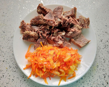 Залейте мясо водой, поставьте на огонь и доведите до кипения. При закипании будет появляться пенка - её необходимо снять. Варите мясо до мягкости 1,5-2 часа. Затем нарежьте мясо на кусочки и верните обратно в процеженный бульон.