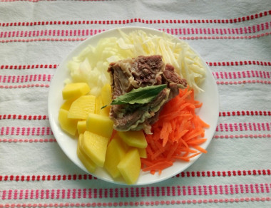 Очищенный картофель нарежьте небольшими кусочками. Нашинкуйте капусту. Отправьте картофель и капусту в кастрюлю к мясу. Оставьте вариться минут на 15-20.