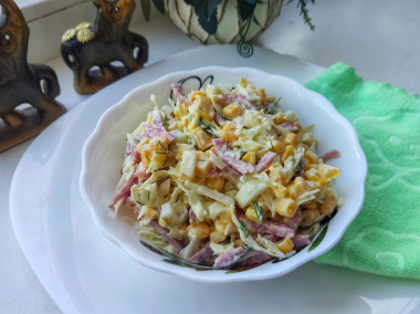 Если хотите приготовить быстрый и вкусный салатик,то салат с копчёной колбасой, кукурузой и капустой-отличный вариант! И готовится быстро,и вкусно получается!