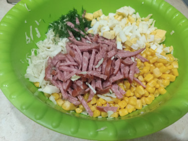 Пока варились яйца, приготовила остальные ингредиенты: капусту нашинковала, колбасу нарезала соломкой. Отваренные яйца остудила и порезала кубиками. С кукурузы сшила жидкость, зелень укропа измельчила.