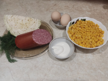 Для салата подготовьте чашу и сложите в неё нарезанную колбасу и капусту. Консервированную кукурузу откройте и слейте лишнюю жидкость. Добавьте кукурузу в салат.