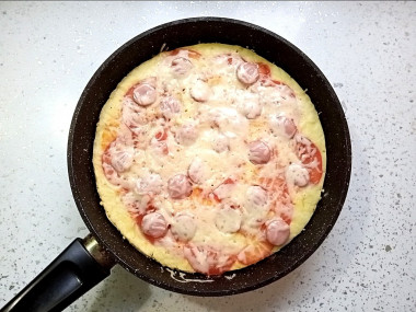 Сверху на тесто нанесла несколько капель кетчупа и разложила сосиски и тонкие ломтики помидора. Сверху посыпала сыром. Сковороду сначала нагрела на большом огне, затем нагрев убавила почти до минимума (средняя конфорка) . Готовилась пицца минут 15 под крышкой. Я опасалась, что верх не пропечется, но все получилось просто прекрасно. Тесто полностью пропеклось, не смотря на сочную начинку! Низ немного зарумянился. Тесто в готовом виде немного плотное, но при этом мягкое и нежное. Очень вкусная пицца получилась!