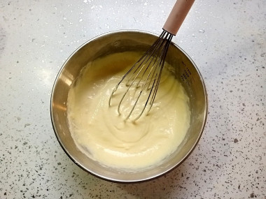 Снова венчиком или миксером смешайте ингредиенты, чтобы тесто получилось густым как сметана и однородным по консистенции. Дайте тесту немного постоять на столе. За это время можно подготовить ингредиенты для начинки.