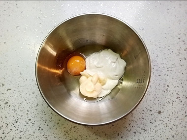 Сначала я смешала крупное домашнее яйцо, сметану жирностью 15 процентов и майонез, посолила. Мука у меня первого сорта. Брала ее столовой ложкой с небольшой горочкой, просеяла. Тесто получилось однородным, гладким, довольно густым.