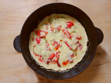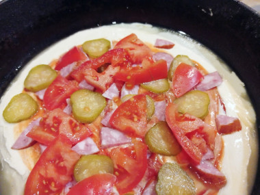 Пиццу готовила в чугунной сковороде диаметром 27 см. Начинку я сделала из краковской колбасы, соленых огурцов, помидоров и, конечно же, сыра. Готовилась пицца около 15 минут.